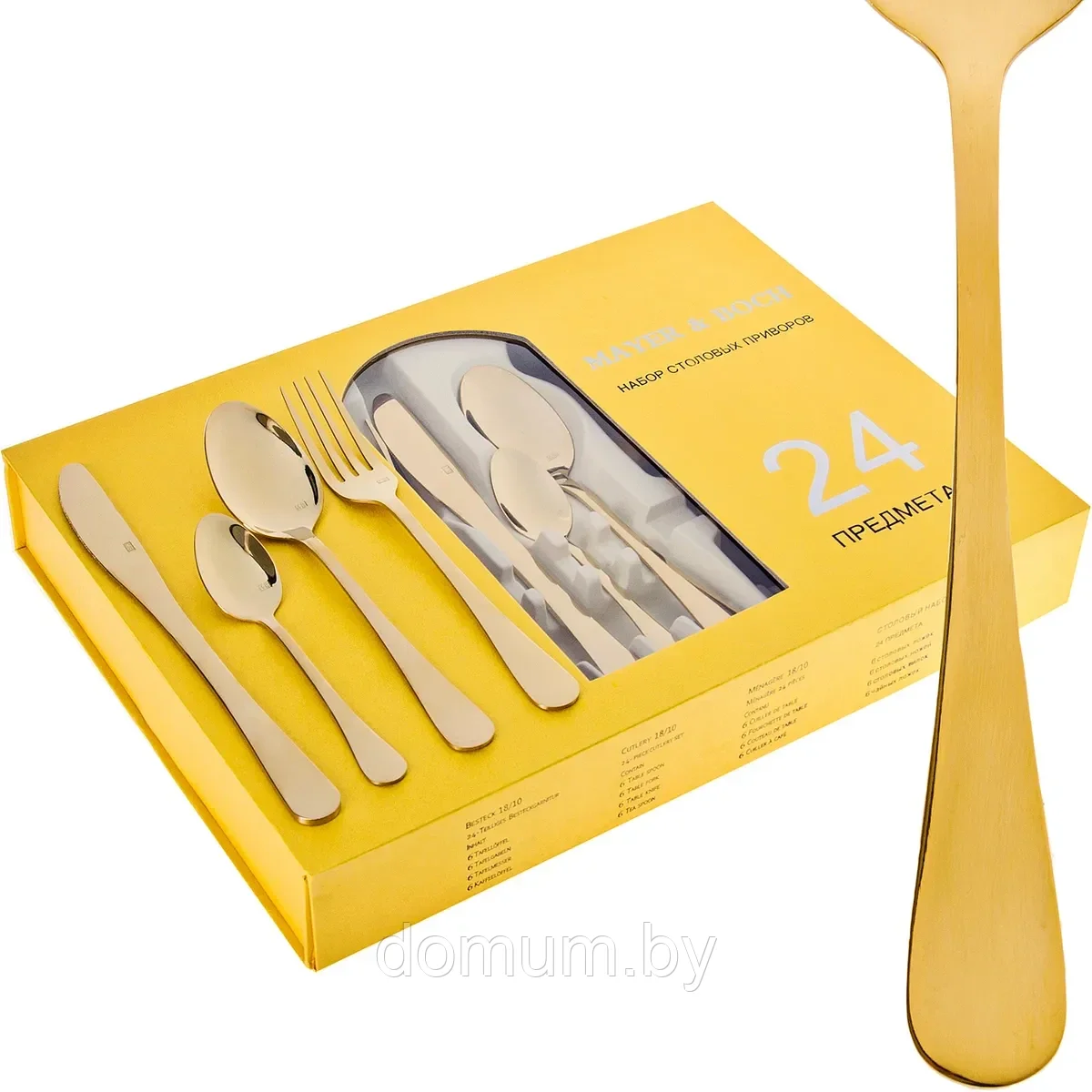 Набор столовых приборов 24 предмета Материал: нержавеющая сталь. Цвет: золотой. Количество: 24 шт. Размер упаковки: 36,9 х 26,7 х 5,8 см. Упаковка: коробка. Вес: 1,81 кг. Набор столовых приборов MAYER&BOCH на 6 персон выполнен из высококачественной нержавеющей стали, ручки приборов имеют глянцевую полировку. Набор из 24-х предметов включает в себя: 6 столовых ложек, 6 вилок, 6 ножей и 6 чайных ложек. Благодаря качественной полировке, изделия сохраняют прекрасный внешний вид на долгое время. Набор обладает не только оригинальным дизайном, но и практичностью, так как изделия из качественной нержавеющей стали имеют высокую прочность, устойчивость к коррозии, кроме того, нержавеющая сталь экологична, она не меняет вкусовые свойства еды, потому как не вступает в реакцию с ее компонентами. Упакованный в красочную подарочную коробку такой набор безусловно станет прекрасным подарком для любой хозяйки и украсит ваш праздничный стол. Подходит для мытья в посудомоечной машине. Производитель: MAYER & BOCH, Electro Z Export & Marketing Ltd. Rothschild Boulevard 74-76, Tel-Aviv 65875, Israel, Tel.:+97235669847. Страна производства: Китай